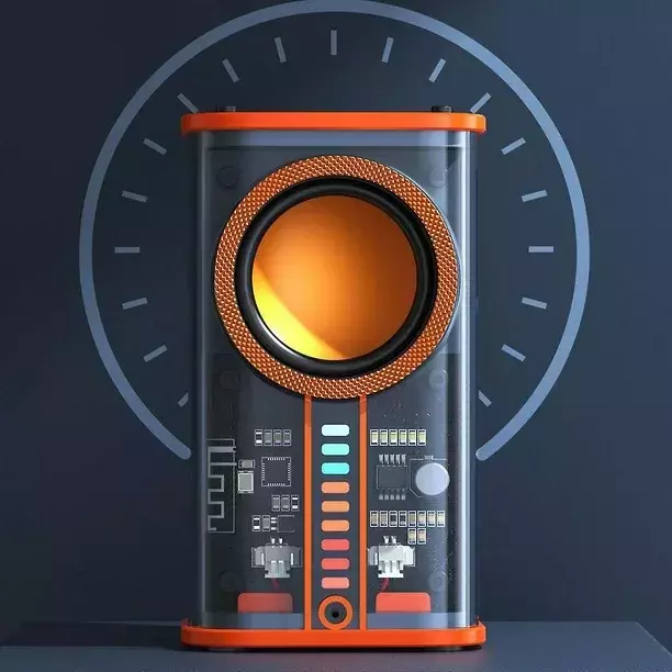 ✓ Diseño futurista y compacto: El cuerpo del parlante está fabricado en materiales transparentes de alta resistencia, lo que le da un aspecto elegante y tecnológico. Su tamaño portátil y peso liviano permiten llevarlo cómodamente en una mochila, bolso o incluso en la mano sin esfuerzo.